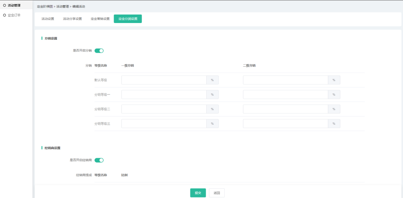 (4)营销设置和分润可设置活动定金的营销及分润信息,相应插件如未开启,则无法 设置,分润中所有插件都没开启则不会有分润设置导航;