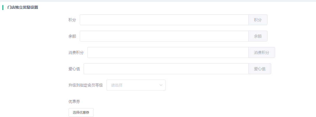 奖励设置:设置领取页面的奖励积分、余额、消费积分、优惠卷,升级到指定会员等级(如选择等级比会员自身所处会员等级低,不会降级)